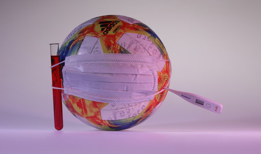 firo: 12.03.2020 Football, 2020 The corona virus paralyzes the whole sport. Game ball with clinical thermometer, mouth protection, symbol for the crisis in sport and society. Covid 19, ball